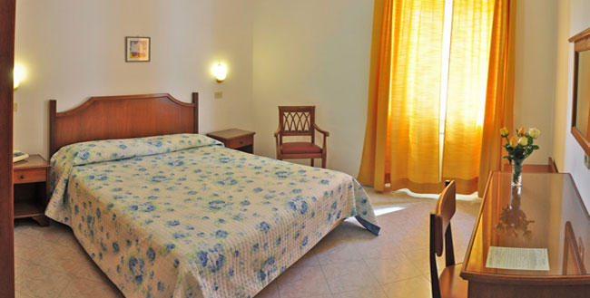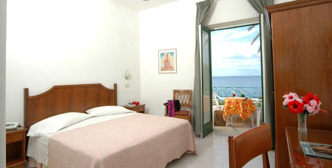 Le camere dell’hotel sono ampie e luminose, dotate di servizi, phon, e con vista mare.